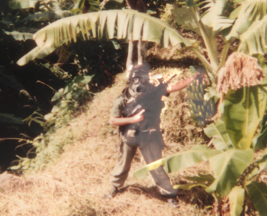 What that Means: The previous evening I got stuck on Guard Duty from midnight to 6:00 a.m. I was using the Night Vision goggles and somehow lost my glasses. You can't use the goggles and wear your glasses at the same time. I eventually found my glasses when it got light out. After being up all night I tried to get some sleep. Later that morning it was announced a VIP was coming to our location, so we had to clean up the site and make ourselves presentable. I got to burn more trash out in the banana patch. This is when Tommy took the photo of me in my Gas Mask by the hanging bunch of bananas.Tuesday 29th November 12-6 guard duty with night vision glasses. lost my glasses. try to sleep in morning. clean up and burn more garbage. Genral Smith was coming. put on ruck & mask to get ready. Lunch take radio - slept cause Rowe was there. go up on roof take pictures. play checkers with Rowe. Running low on batteries. 7:00 write. crashout at 8:00 - before dinner. H minister came & gave Thanksgiving Service Downstairs 12 - 6am guard night goggles