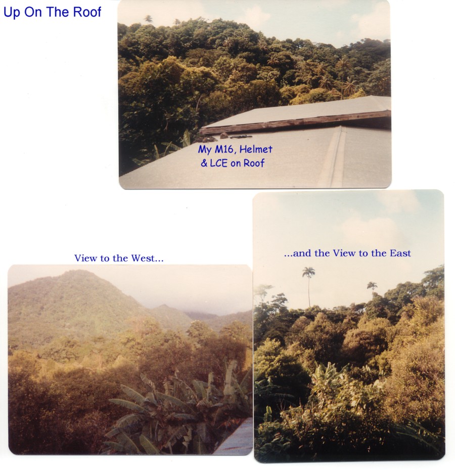What that Means: We rode to Green Ramp at Pope Air Force Base. We hung out for a while waiting for the aircraft to be ready. We had to wait for them to finish fueling up the aircraft before we boarded. After the plane took off everyone slept on the floor of the plane. The floor of the plane was warm! We landed about 7:00 am and were excited to see Palm trees and warm weather. We went to the Grand Anse College Campus and waited until 3:00 for our afternoon helicopter flight north to Gouyave. From there we went to Gouyave, then up to our communications site in the banana patch, a.k.a. The Hilltop Hotel. We were there to replace Sgt Rennaker and another guy, who were members of our own platoon. He showed us the basics on how to operate the TAC SAT. Since it was the rainy season, it Rained a lot.Saturday 26th November 1983 eat some pizza & chat. walk out on ramp. 2:30 wait. take off 3:00 look at deck. sleep on floor - warm. wake up look out window - water clouds. on deck. land 7:00. look out door - palm trees. gonzales 2 1/2 ton to college at grand anse. sit in shade. chat with Mathews. go on beach, eat coconuts. 1500. black hawk to LZ Vicki Rowe and I sit in rain 'till jeep comes. ride to Gouyave. ride up hills to banana station. Rennaker shows us the TAC SAT. - Rain Rain Rain